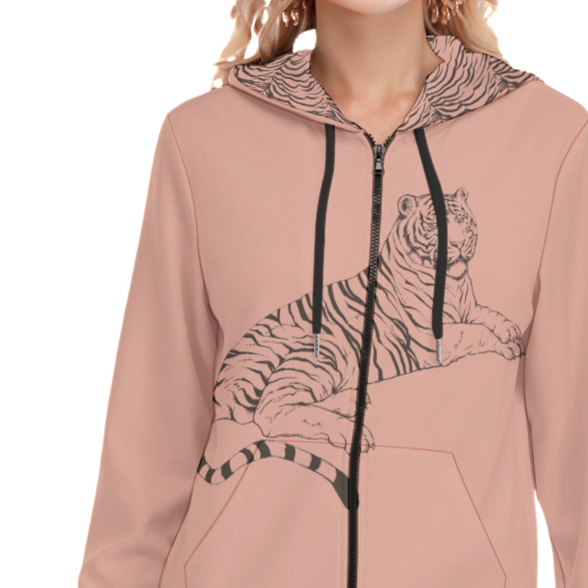 Pink Tiger Japanese Vintage Print Women's Long Sleeve Hoodie With Zipper