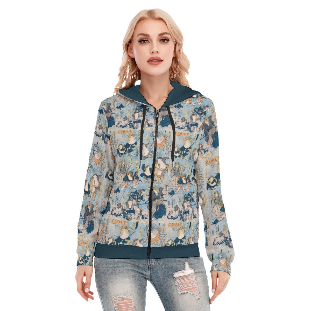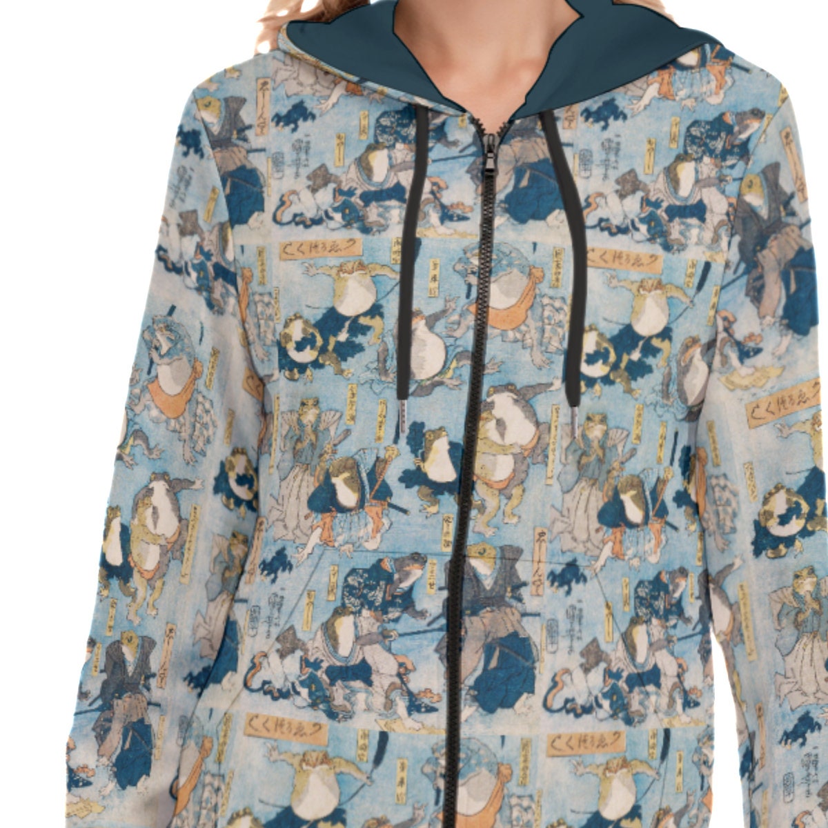 Samurai Frogs Vintage Japanese Art Women's Long Sleeve Hoodie With Zipper