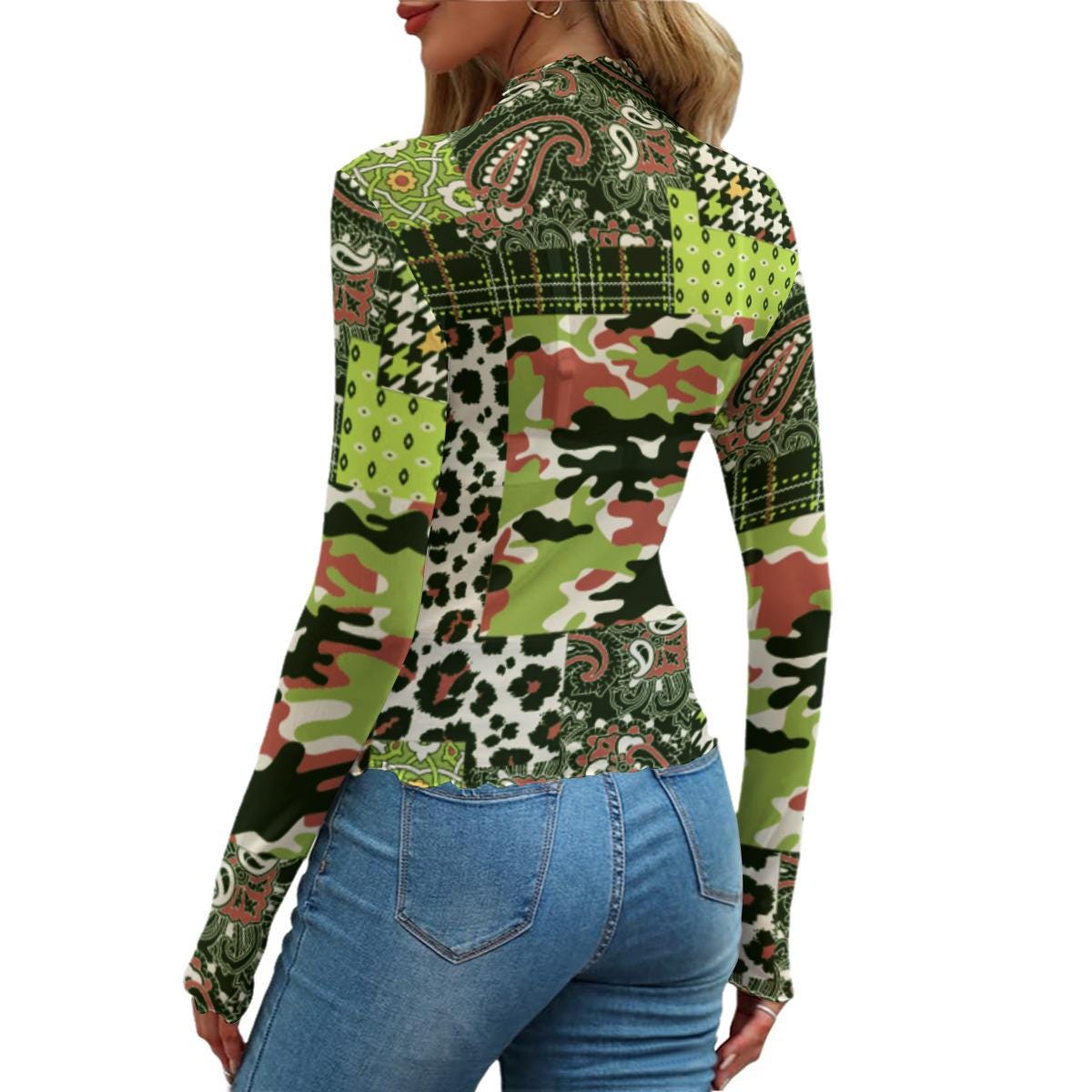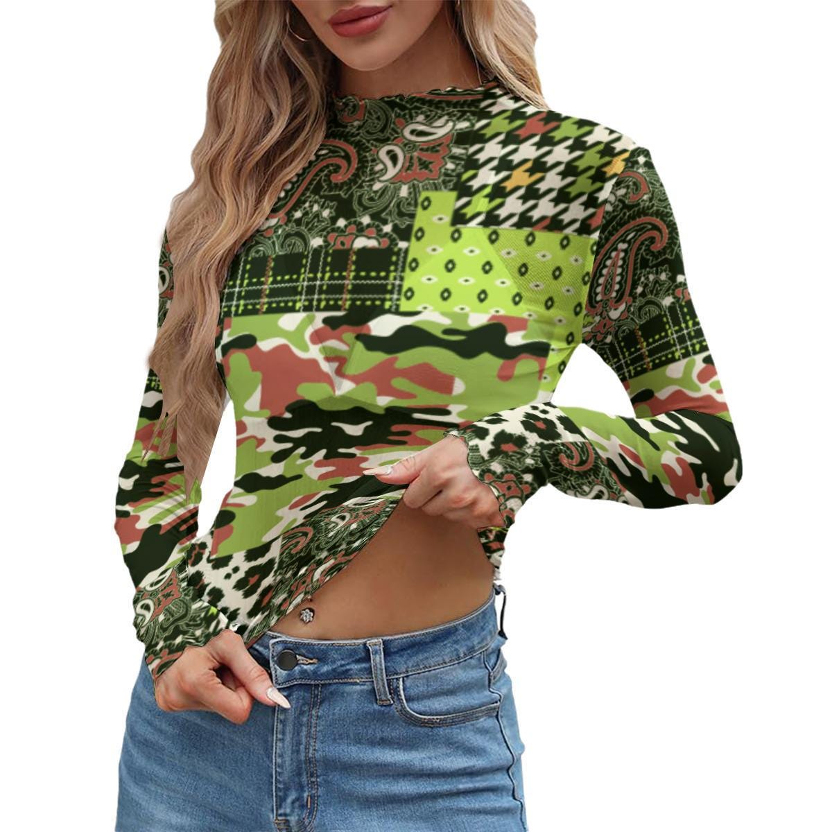 Designed with a bold patchwork print in layered greens, this piece mixes camo, abstract textures, and geometric elements into one statement look. The fabric is lightweight and stretchy, hugging your body while staying breathable and comfortable.