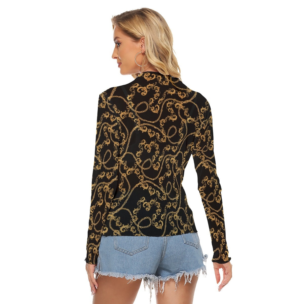Golden Chains and Swirls Print Women's Mesh Top Black Long Sleeves Free Shipping up to 6XL