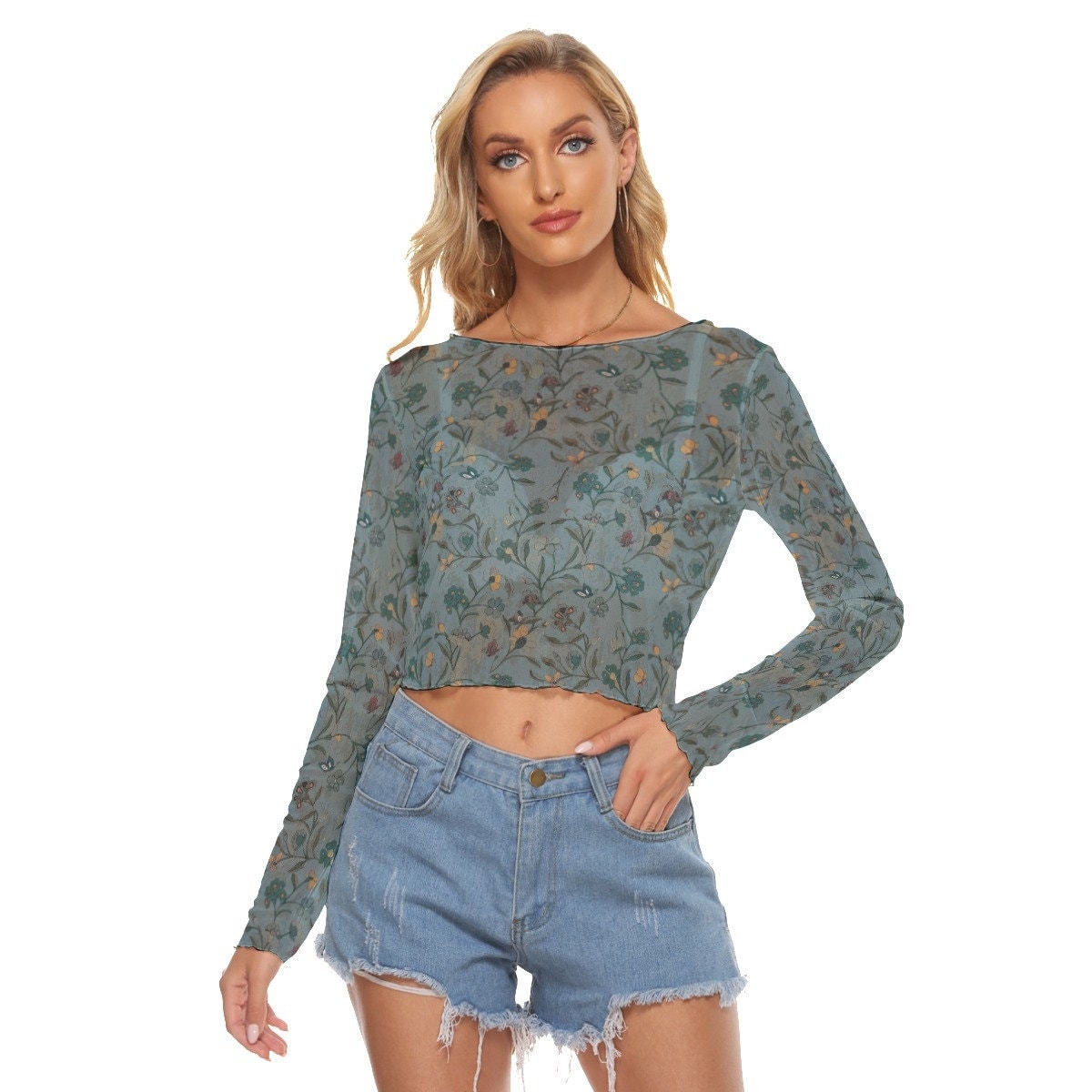 Semi-sheer breathable silky fabric with light stretch. Delicate elongated sleeves, romantic Medieval floral pattern. Comes in two styles- Crop Top and Classic Length