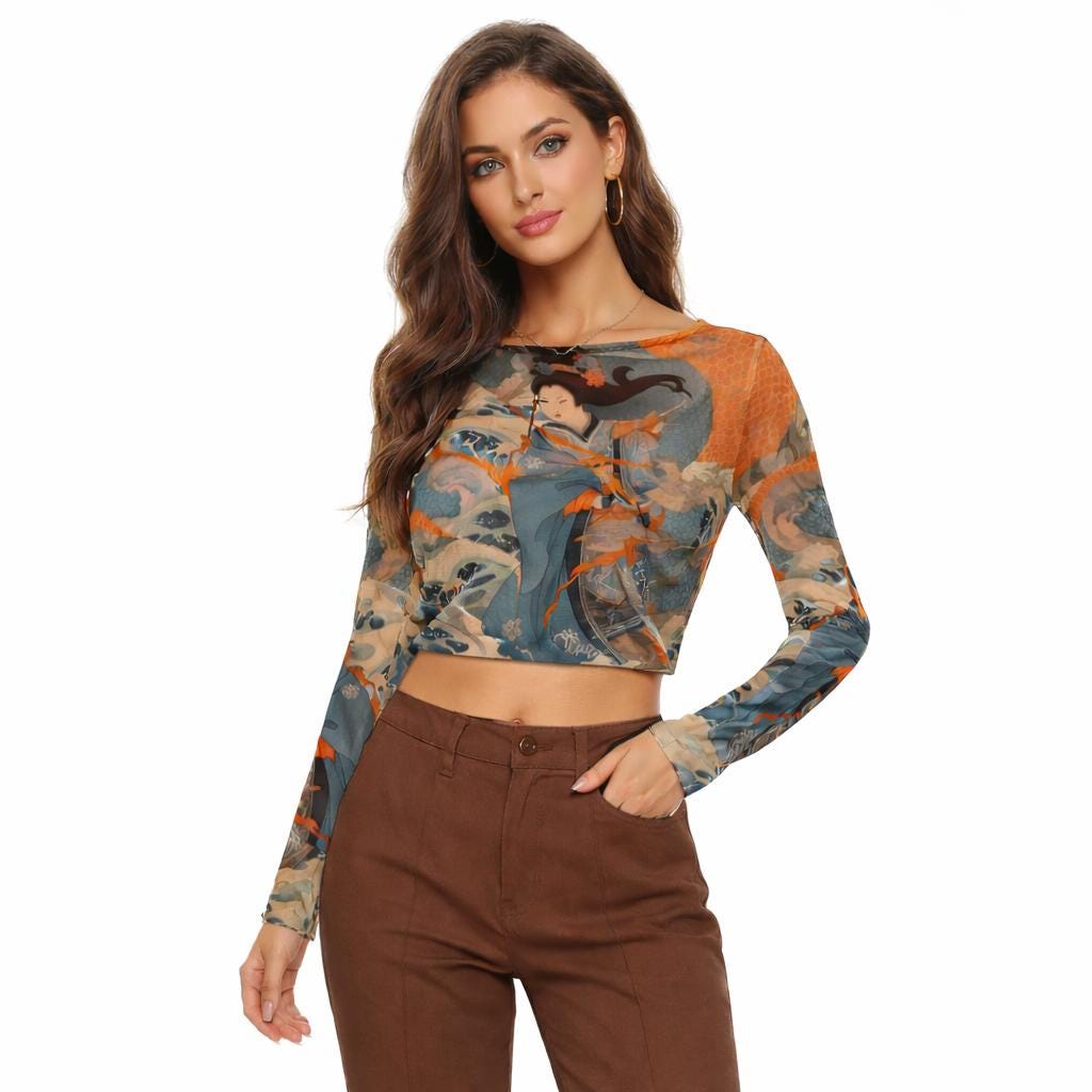 Akuma Warrior Oriental Art Print Women's Mesh Crop Tops Long Sleeves up to 6XL