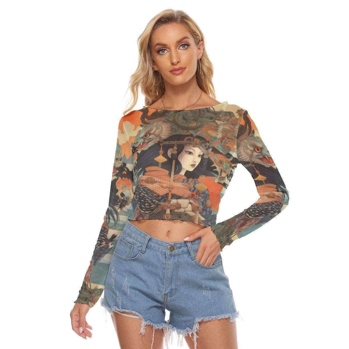 Japanese art print print women's mesh crop top long sleeves two styles up to 6xl