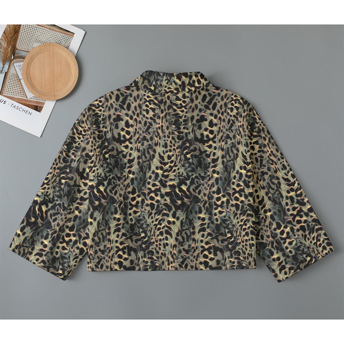 This cropped cotton jacket is all about texture and effortless style. The all-natural fabric with an abstract, almost camo-like pattern in earthy greens, beige, and black.