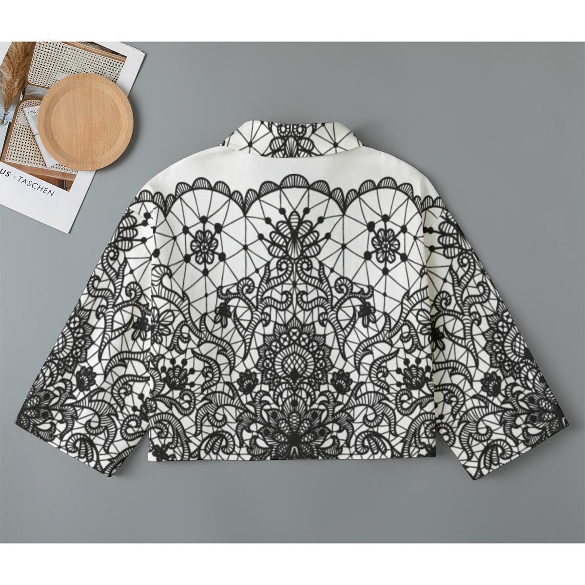 A statement cotton jacket that blends elegance with edge. Featuring a bold black lace-inspired print on a crisp white base, this piece is all about contrast and confidence. The relaxed fit gives off effortless vibes, while the silver button closure adds a sleek touch. A single pocket keeps things cool and casual. Dress it up or down—either way, you’ll turn heads.