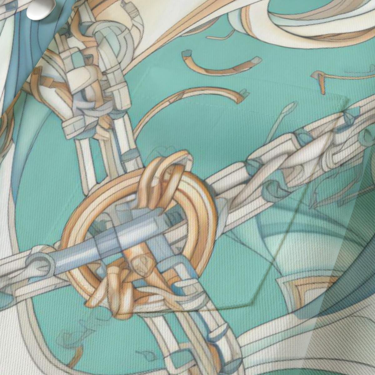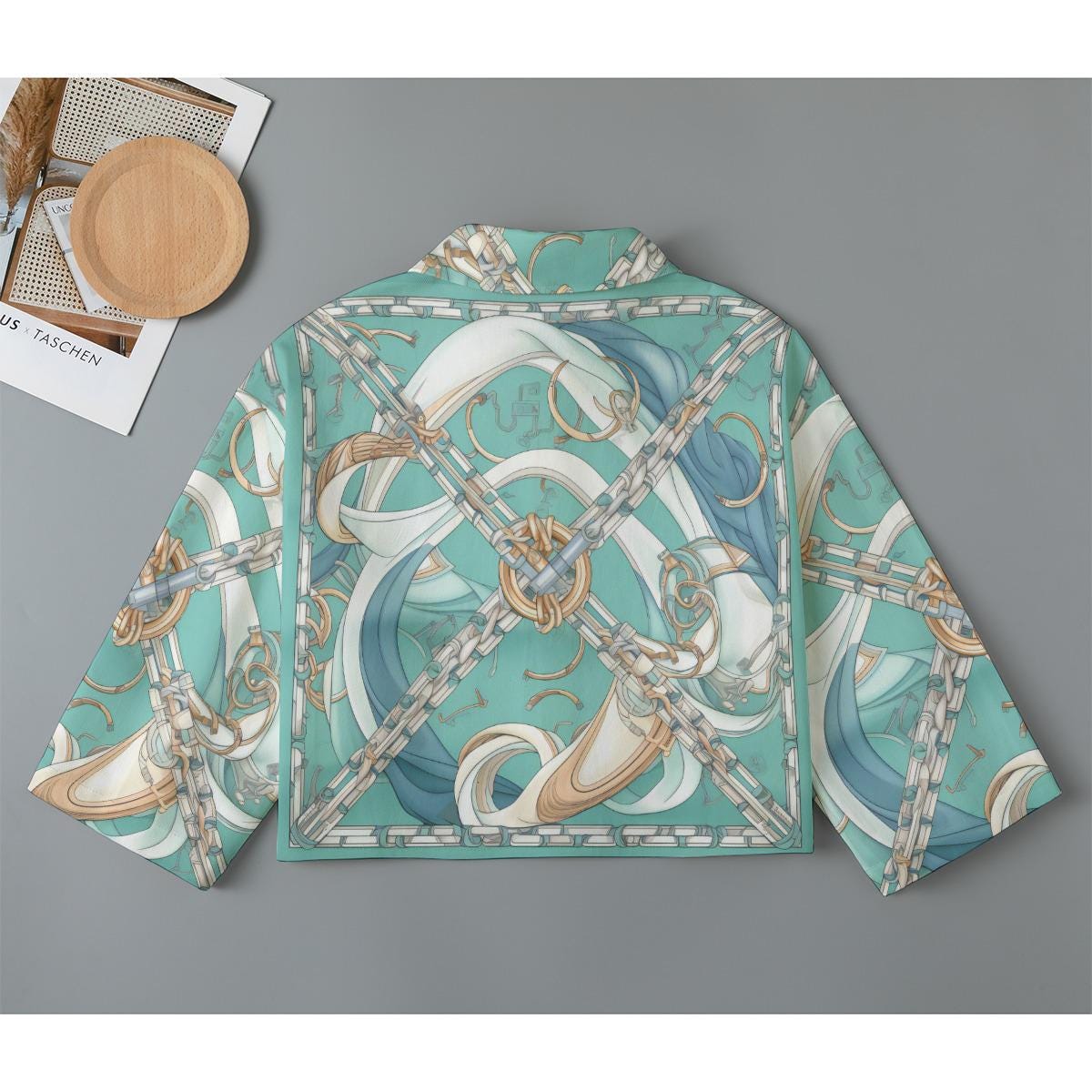 Meet "Marea"—a cotton jacket that flows with effortless elegance. Its soft aqua tones and intricate chain-and-rope print give off a luxe, nautical feel, perfect for those who love a touch of sophistication with a relaxed edge. The structured yet lightweight silhouette is finished with gleaming silver buttons and a sleek pocket for a hint of utility. Whether you're channeling seaside chic or city cool, Marea is your perfect statement piece.
