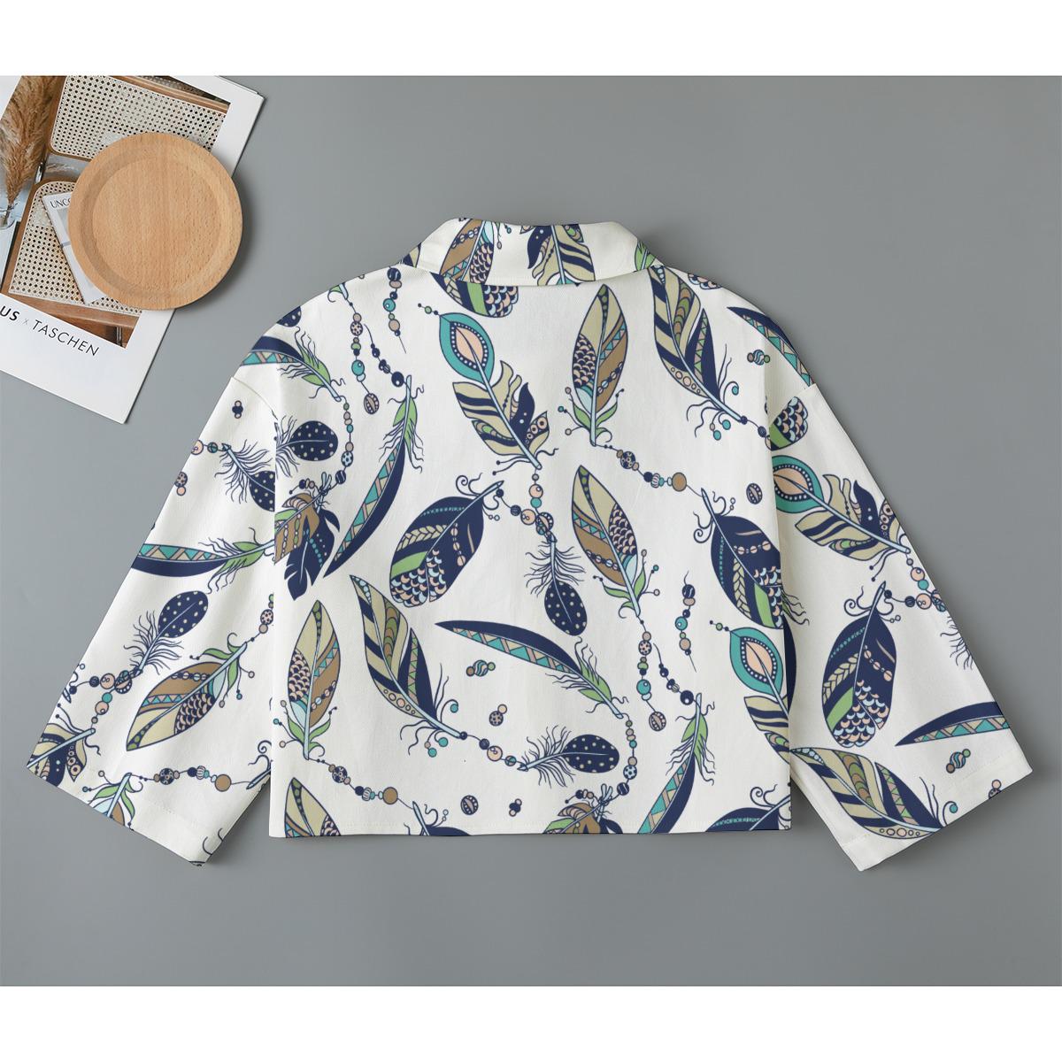 A stylish, patterned button-up jacket featuring a botanical feather-like design in blue, green, and beige on a white background. A flattering cut for any figure.