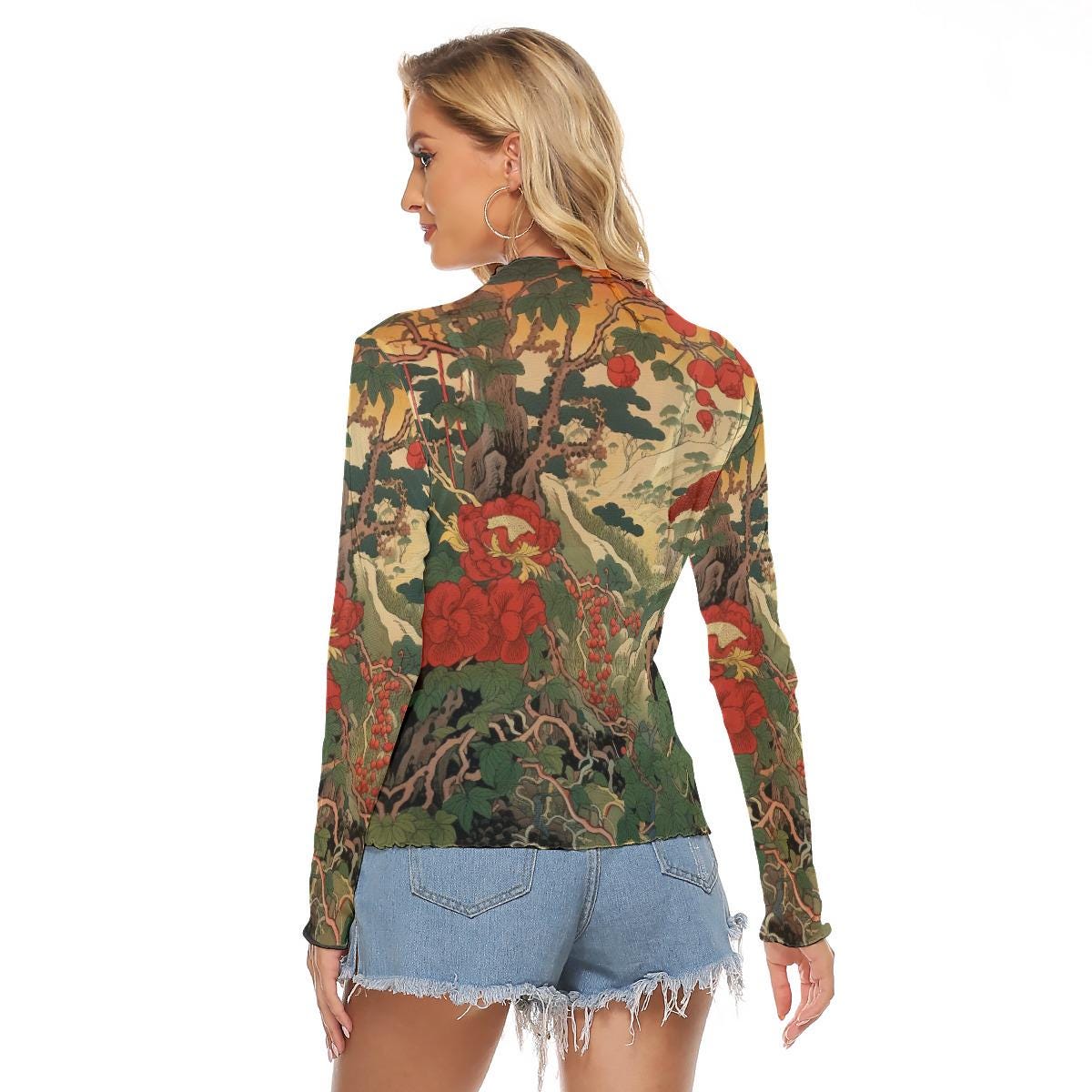 Step into art with this striking long-sleeve top, featuring a tapestry-inspired floral and foliage print in earthy greens, bold reds, and warm golden tones. The lightweight fabric drapes effortlessly, creating a flattering silhouette that pairs perfectly with casual denim or elevated evening pieces. Designed with a fitted cut and higher neckline, it adds a touch of sophistication while keeping a relaxed, wearable vibe.